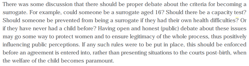 - Integrity of implications counselling – this needs further exploration as to the integrity of the counselling surrogate mothers receive. It is also not compulsory and surrogacy arrangements can be made online with no framework of support for the woman for this significant and potentially life-changing decision.